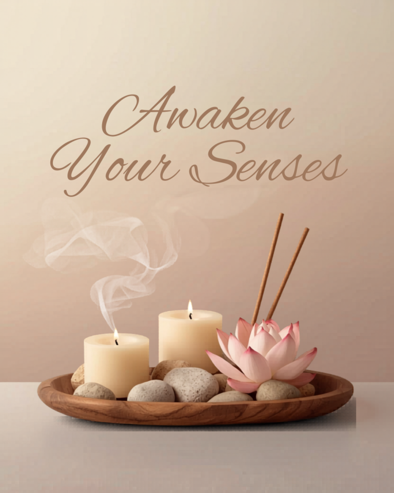 Capture an intimate, cozy setting with elegant candles in glass jars, artisanal incense sticks resting in minimalist holders, and subtle natural elements like dried flowers, wood, or stone. The mood is शांत, meditative, and inviting—perfect for relaxation, self-care rituals, and quiet evenings.